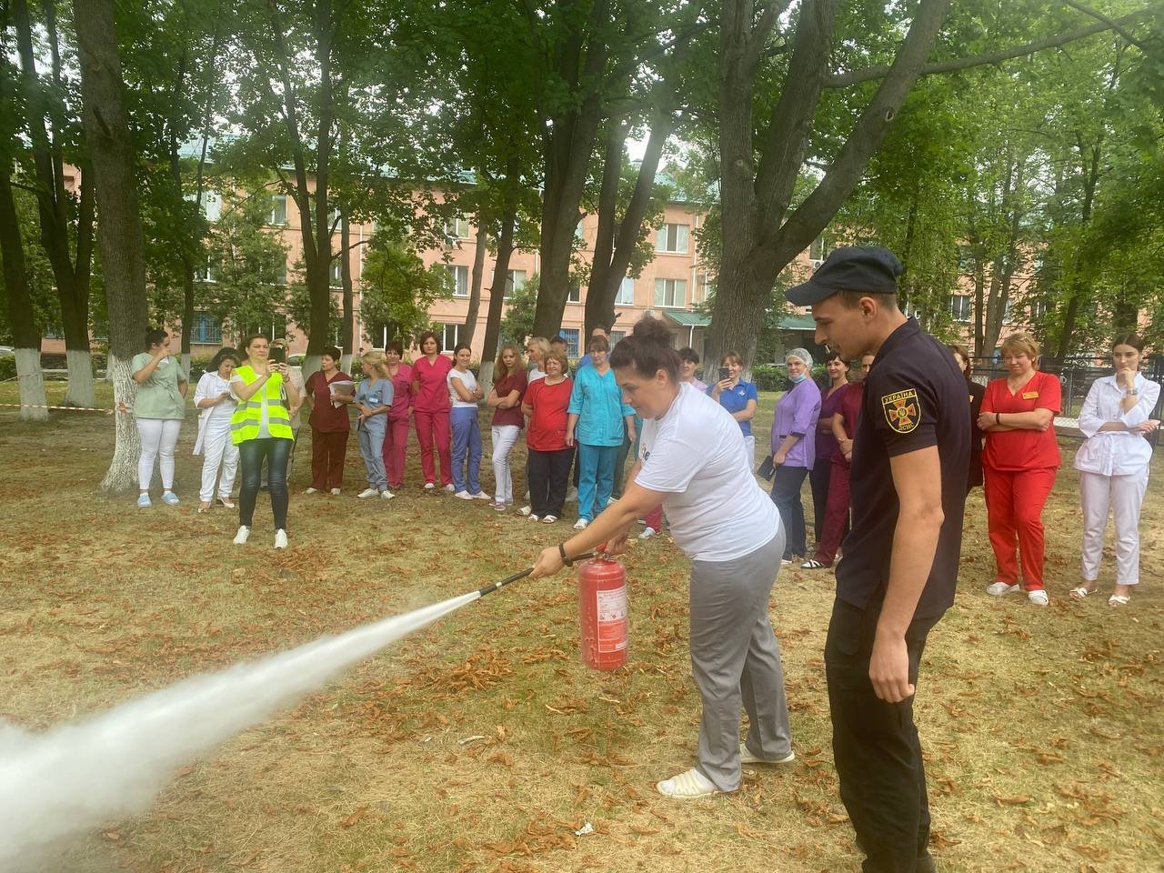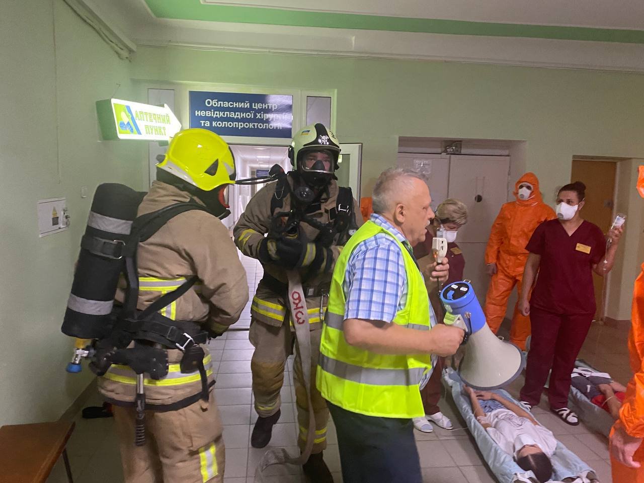 - евакуація пацієнтів, в тому числі лежачих на ношах, та працівників під час сигналу повітряної тривоги у безпечне місце та локалізація пожежі;
