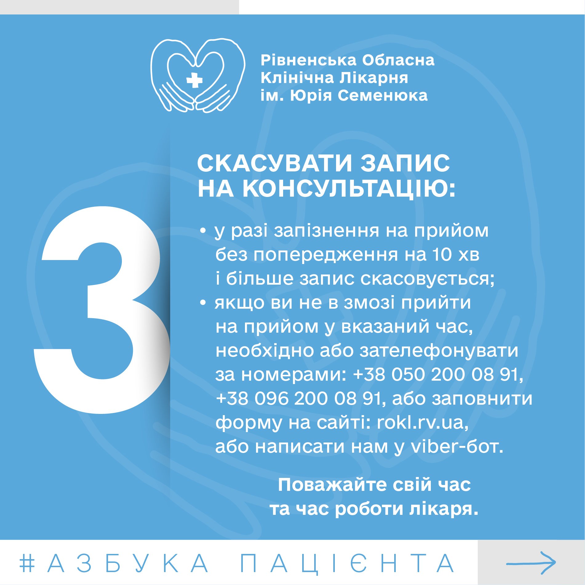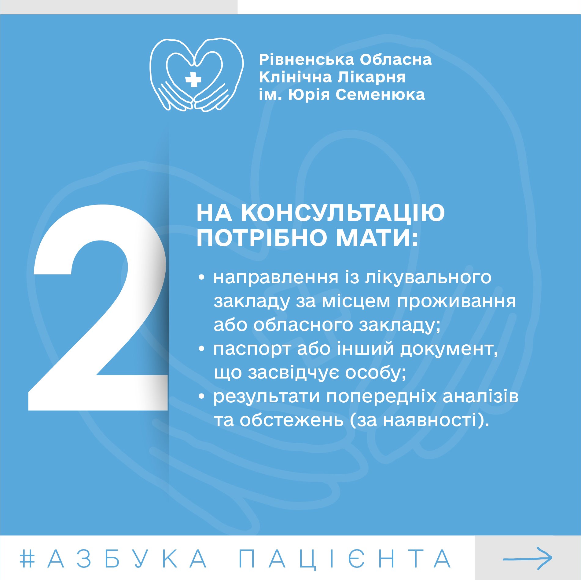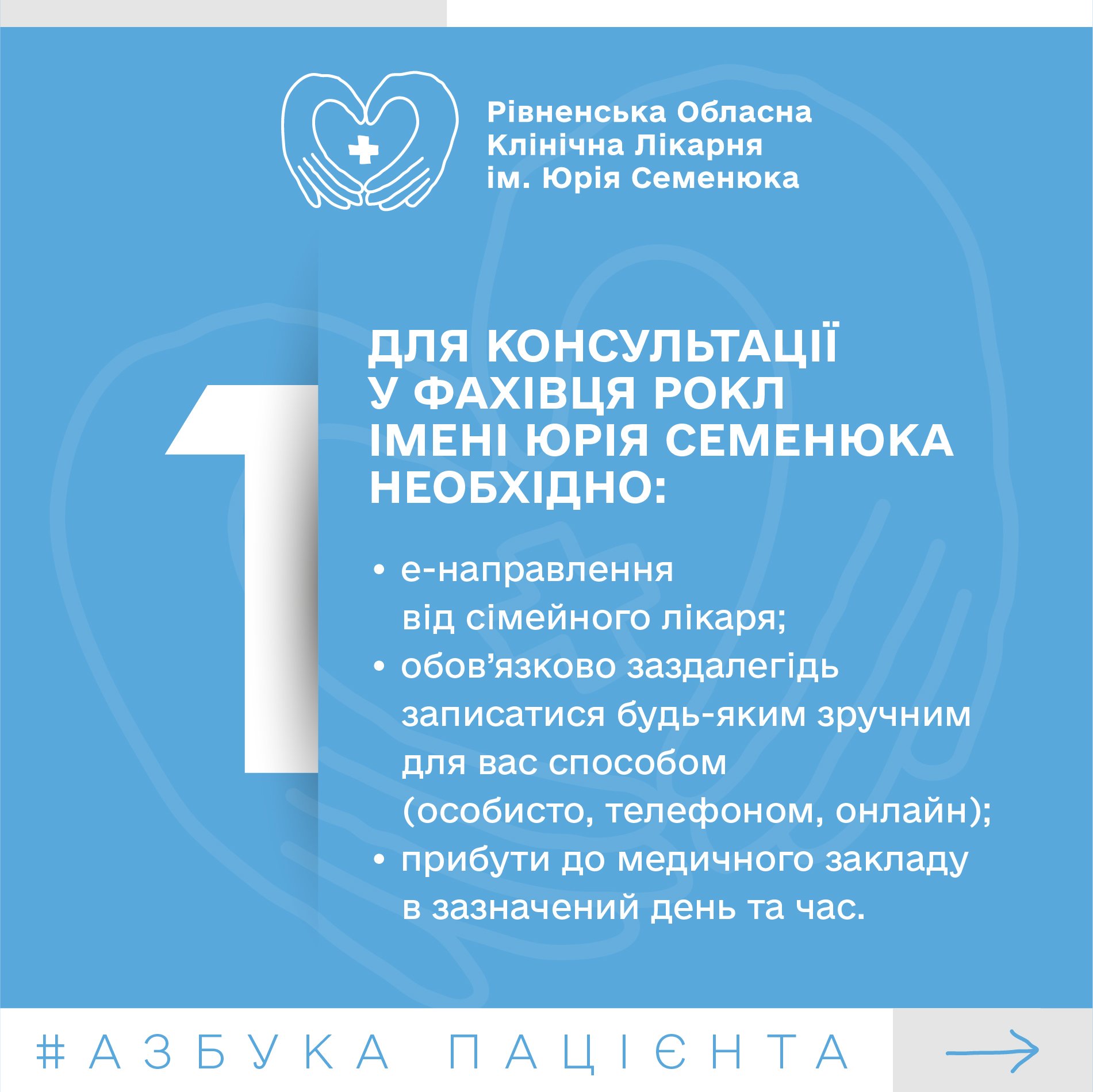 Безкоштовну консультацію фахівців РОКЛ імені Юрія Семенюка можуть отримати усі, хто цього потребує, маючи е-скерування від сімейного лікаря або на основі платної послуги. Для цього необхідно звернутися до Амбулаторно-поліклінічного відділення лікарні. Що ще, окрім направлення, потрібно мати із собою на прийомі в лікаря та як діяти у разі неможливості відвідати фахівця після запису, розповідаємо далі.