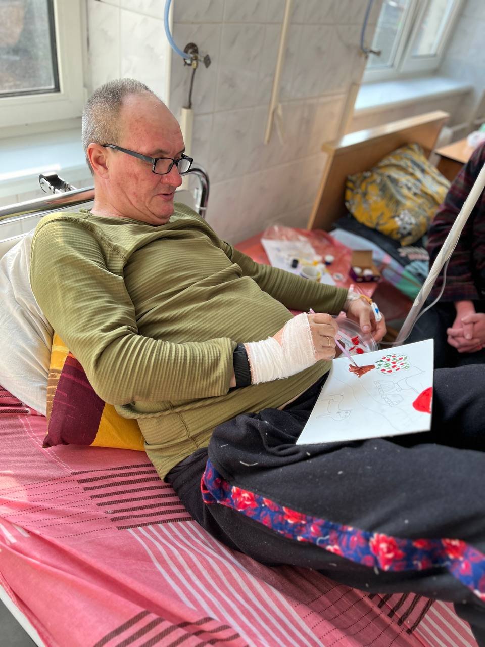 Військовослужбовець Олександр, хоч і одразу погодився взяти участь у терапії, аби швидше проходив час у лікарняних палатах, проте був налаштований, що йому це швидко набридне, він почне нервувати, а згодом і взагалі розірве полотно, але сталося зовсім не так. Під час роботи з пензлем і фарбами хвилювання виникали, та все ж чоловік старанно підбирав різні відтінки потрібного кольору, аби завершити картину, та навіть пообіцяв показати її рідним.